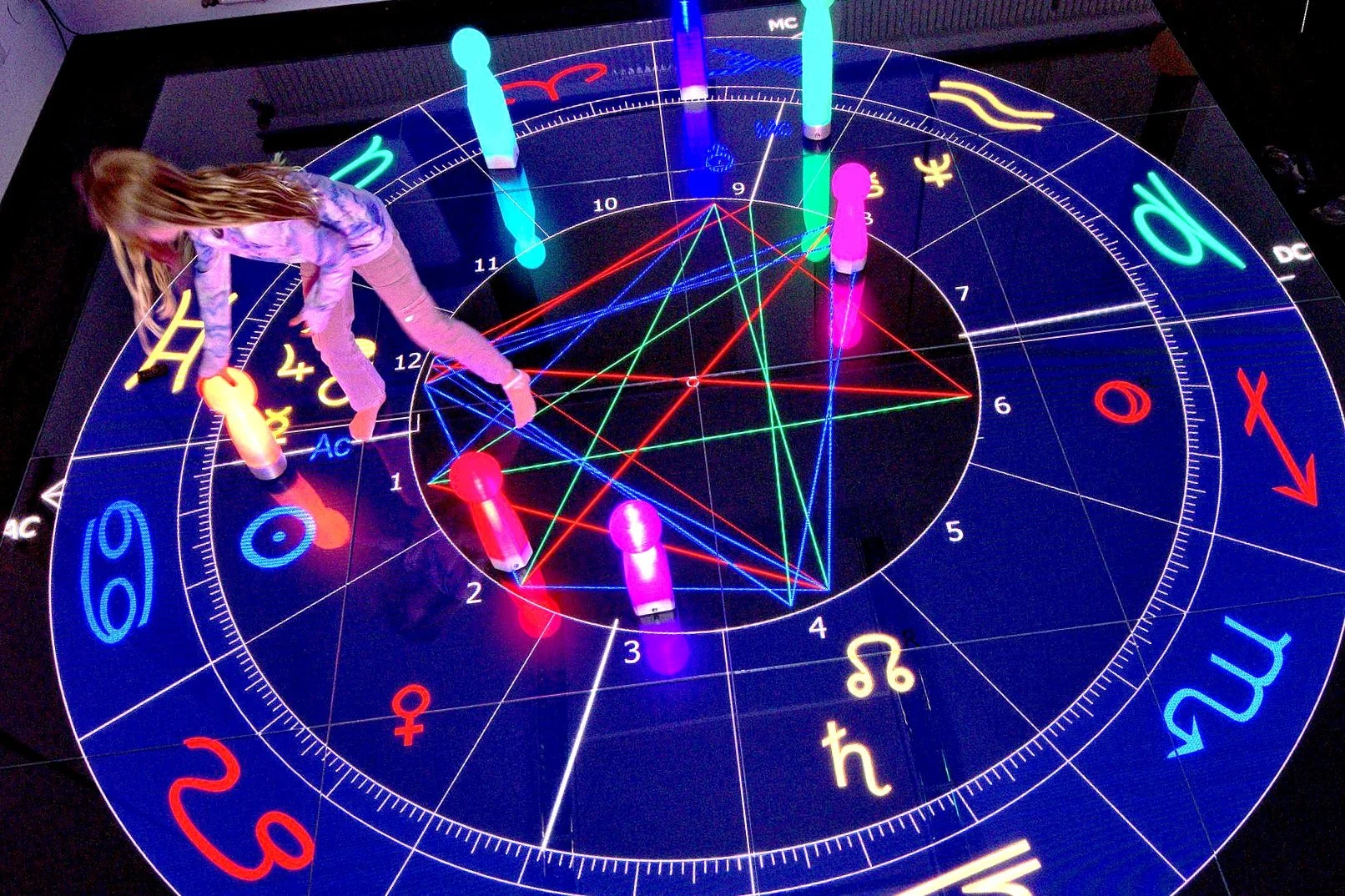 Du betrittst eine energetisierte Bühne mit vier Millionen Lichtpunkten unter Dir. Auf sechzehn Quadratmetern "Astrobühne" entfaltet sich hochpräzise Dein begehbares Geburtshoroskop. Deine persönlichen Energien können nun an den individuellen Lebenspunkten wahrgenommen werden.